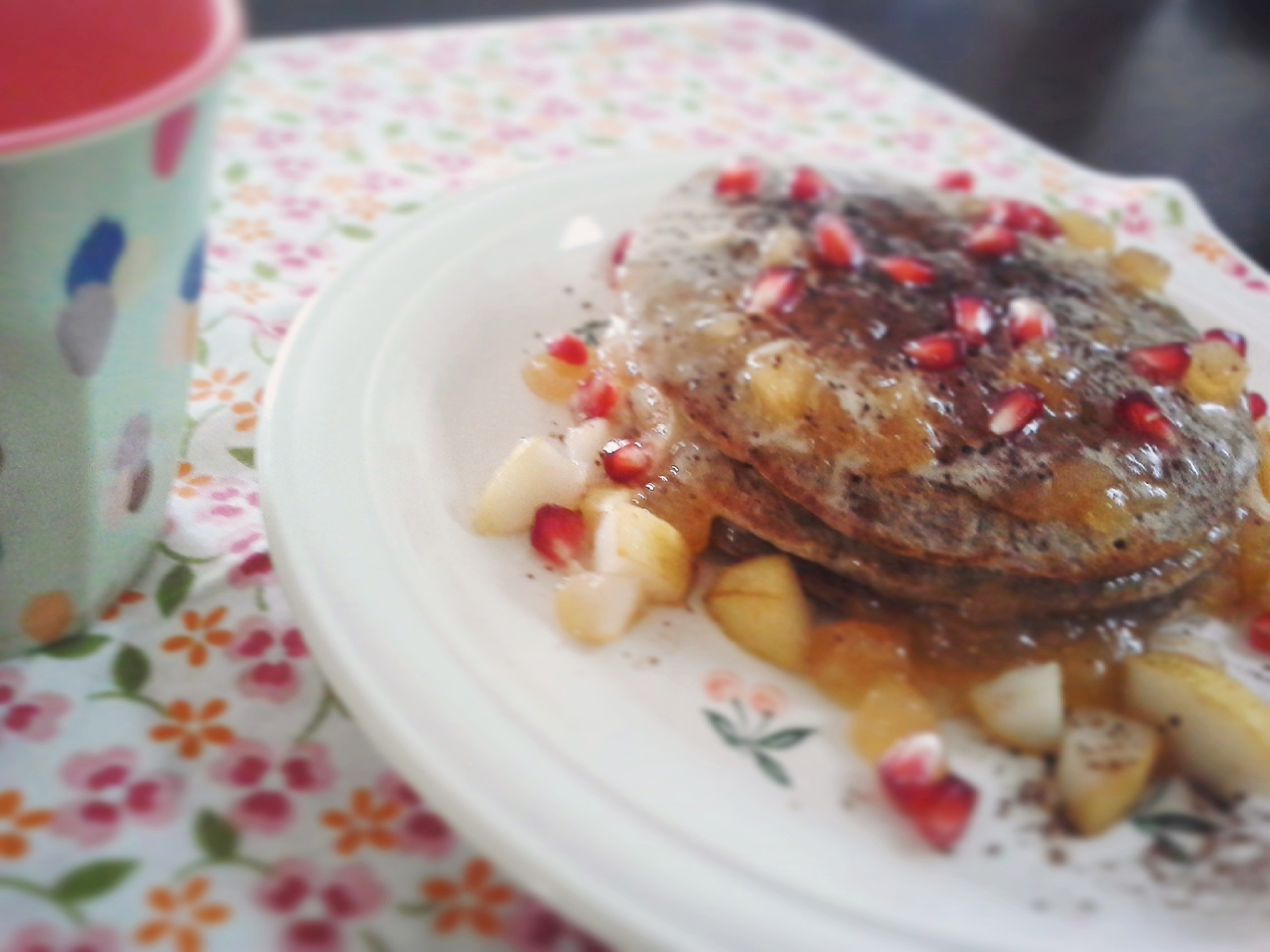Qui li ho serviti con marmellata di pere e zenzero, crema di mandorle, pere fresche, una spolverata di cacao e chicchi di melograno.